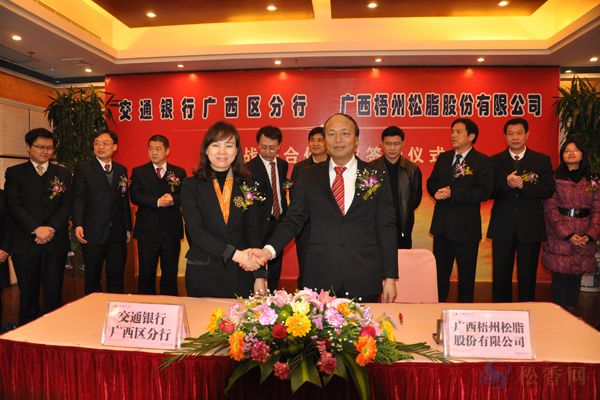 董事長孔仕才(右)與交通銀行廣西分行趙紅蓮握手致意。