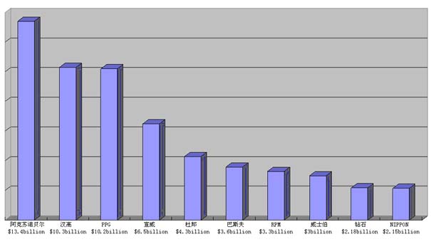 油漆涂料頂級(jí)品牌公司整合并購加劇,并加速亞洲市場的開發(fā),尤其是中國市場,阿克蘇諾貝爾牢牢占據(jù)領(lǐng)先位置,居全球的第1,得益于收購帝國化學(xué)ICI,雖然在出售了英國涂料公司王冠crown。PPG收購式馬卡龍進(jìn)一步鞏固了市場地位。RPM加大內(nèi)部品牌整合力度。鉆石涂料在收購四季涂料和弗羅斯特涂料,排名躍居世界的第9。世界十大油漆涂料品牌公司排名:表1