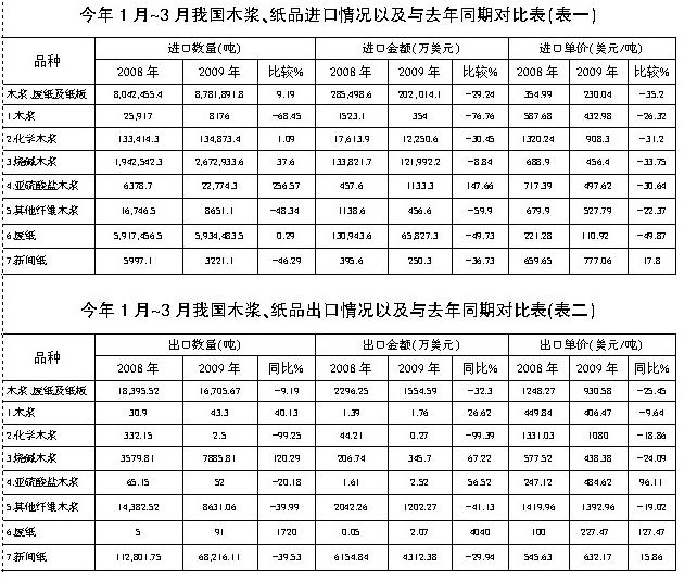 下面結(jié)合國(guó)家海關(guān)最近提供的最新統(tǒng)計(jì)數(shù)據(jù)(見表1、表2),對(duì)今年第一季度我國(guó)木漿、紙品幾個(gè)品種以及新聞紙進(jìn)、出口總體情況進(jìn)行比較和分析。