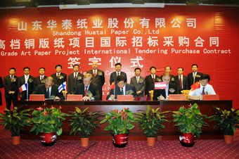 6月17日,華泰紙業(yè)45萬噸高檔銅版紙項(xiàng)目國(guó)際招標(biāo)采購(gòu)合同簽字儀式在華泰工業(yè)園舉行。東營(yíng)市市委常委、廣饒縣縣委書記趙豪志,縣長(zhǎng)田和友,市經(jīng)貿(mào)委副主任龍艦,縣委常委、大王鎮(zhèn)黨委書記楊同賢等政府領(lǐng)導(dǎo),集團(tuán)董事長(zhǎng)李建華,以及中標(biāo)單位美卓造紙與紙漿總裁Bertel、安德里茲亞洲區(qū)副總裁Gary、ABB亞太區(qū)域銷售經(jīng)理Jean—christophe bussolaro、長(zhǎng)沙長(zhǎng)泰輸送包裝設(shè)備有限公司總經(jīng)理簡(jiǎn)澤豐等出席簽字儀式。儀式由山東齊信招標(biāo)公司趙欽軍經(jīng)理主持。