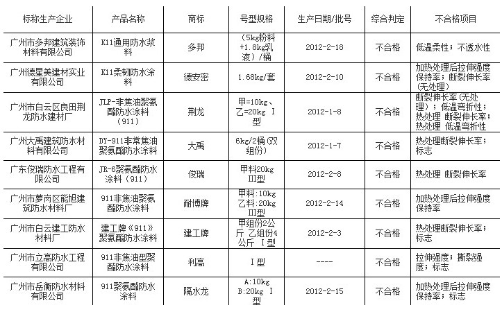 2012年廣州市防水材料質(zhì)量監(jiān)督抽查不合格產(chǎn)品及其企業(yè)名單