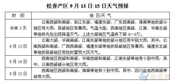 華訊松香網(wǎng)溫馨提醒:未來三天,兩廣、云南、福建、江西等地降雨范圍有所擴大,其中廣西西南部、廣東、云南大部、福建東部等地區(qū)有中到大雨或暴雨。氣溫方面,受較強冷空氣影響,江南大部將出現(xiàn)4-6℃的降溫,晝夜溫差較前加大。另今年第16號強熱帶風暴“三巴”于9月12日20時加強為臺風,未來2天對我國暫無影響。本周,江西、福建、云南等產(chǎn)區(qū)松脂量較前有不同程度增加,但整體脂量較往年同期仍偏少。隨著降雨降溫天氣的來臨,后期松脂量能否持續(xù)釋放仍有待觀察。