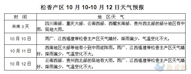 華訊松香網(wǎng)提醒:未來(lái)三天除川南及云貴西部地區(qū)持續(xù)陰雨天氣外,粵桂閩贛等其他產(chǎn)區(qū)天氣晴好,且高溫天氣基本退去,較利于松脂采收工作的進(jìn)行。當(dāng)前總體天氣情況較利于松脂的釋放,從目前市場(chǎng)看來(lái),雖然各地松脂價(jià)格跟隨香價(jià)較前期有一定幅度上調(diào),松脂量尚未出現(xiàn)大幅釋放,隨著天氣漸涼,松脂將趨于減少,不排除后期有部分脂農(nóng)及松脂供應(yīng)商出現(xiàn)惜售囤脂現(xiàn)象。