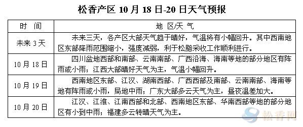 華訊松香網(wǎng)溫馨提醒:未來三日,西南地區(qū)東部降雨范圍有所縮小,強度減弱,兩廣、福建、江西、貴州等地大部以多云轉(zhuǎn)晴天氣為主,氣溫小幅回升;另隨著秋季深入,各地晝夜溫差加大。當前多數(shù)產(chǎn)區(qū)已臨近生產(chǎn)旺季尾期,松脂供應商采脂售脂積極性不高,局部采脂工提前下山,市場脂量持續(xù)偏少;云南地區(qū)已進入生產(chǎn)旺季,但脂量亦未見明顯放大。后期脂量或由價格主導。