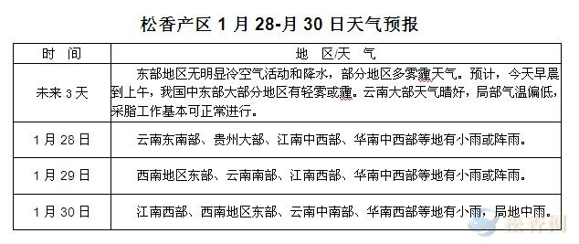 華訊松香網(wǎng)提醒:未來(lái)三天各產(chǎn)區(qū)無(wú)明顯冷空氣活動(dòng)和降水,部分地區(qū)多霧霾天氣。其中云南大部天氣晴好,局部氣溫偏低,采脂工作基本可正常進(jìn)行。除云南外的其他產(chǎn)區(qū)均已停止收脂工作,云南地區(qū)松脂量持續(xù)偏少,上周末部分接有訂單的工廠小幅上調(diào)價(jià)格以保證原料供應(yīng)。據(jù)悉,本周云南采脂工人將陸續(xù)放假下山,并因區(qū)域風(fēng)俗不同,大部分地區(qū)春節(jié)假期將持續(xù)近一個(gè)月,預(yù)計(jì)到3月中下旬才有新一批的松脂下山。