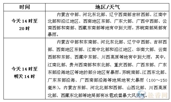 預(yù)計(jì)25日14時(shí)至26日14時(shí),西南地區(qū)東部、江南北部及沿江地區(qū)、華南沿海及廣西東北部、西藏東南部等地的部分地區(qū)有大雨或暴雨,其中,蘇皖南部、江西東北部、廣東東部沿海、廣西南部沿海等地局地有大暴雨(100~150毫米)。另外,內(nèi)蒙古東南部、河北東北部、吉林西南部、遼寧西南部、云南西部等地局地有大雨。上述地區(qū)局地并伴有短時(shí)雷雨大風(fēng)或冰雹等強(qiáng)對(duì)流天氣。