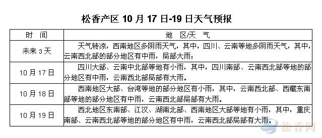 華訊松香網提醒:未來三天兩廣、江西福建等松香主產區(qū)秋高氣爽,除了晝夜溫差較大之外,天氣情況較好。值得關注的是西南地區(qū)多陰雨天氣,屆時云南、四川等地降水持續(xù),尤其云南多地受雨水天氣影響,松脂量或將不會大量釋放,但是否對會在松香市場整體走勢有所影響,有待觀察。