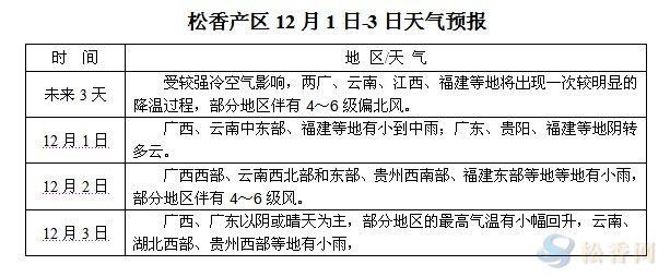 華訊松香網(wǎng)提醒:受較強(qiáng)冷空氣影響,未來三天,各產(chǎn)區(qū)均不同程度的降溫。福建、江西采脂進(jìn)入收尾階段,兩廣地區(qū)也進(jìn)入產(chǎn)季尾期,正陸續(xù)上山采脂的脂農(nóng)請注意氣溫下降對出脂的影響,以及大風(fēng)對松脂質(zhì)量的影響,合理安排采收。