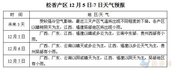 華訊松香網(wǎng)提醒:受較強(qiáng)冷空氣影響,未來(lái)三天,各產(chǎn)區(qū)均不同程度的降溫。各產(chǎn)區(qū)以多云天氣為主,降溫與陰天將對(duì)松脂出油量產(chǎn)生影響,仍在上山采脂的脂農(nóng)請(qǐng)注意天氣變化,合理安排采收。