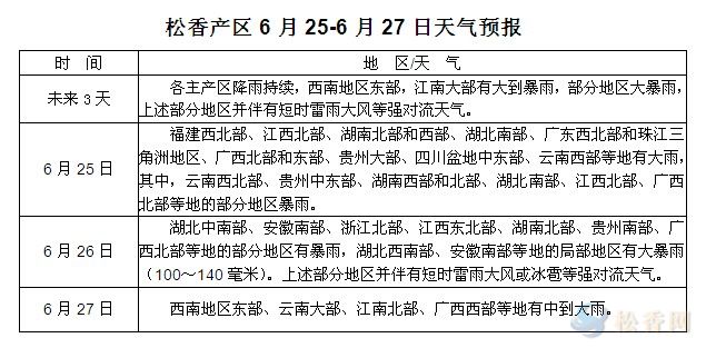 華訊松香網(wǎng)提醒:未來三天各產(chǎn)區(qū)降雨天氣持續(xù),部分地區(qū)強(qiáng)度略有趨弱,但總體未有明顯改觀。近期降雨天氣過于頻繁,端午期間粵桂贛等局地強(qiáng)降水造成的了較嚴(yán)重的洪澇災(zāi)害,受災(zāi)地區(qū)松脂采割及運(yùn)輸工作將中斷一段時(shí)間。從目前天氣情況看,松脂短時(shí)間內(nèi)放量的可能性不大,且部分地區(qū)工廠或因脂量偏少略上調(diào)脂價(jià)以保證原料供應(yīng)。