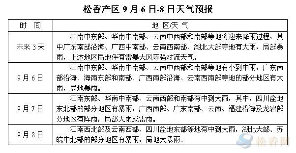 華訊松香網(wǎng)溫馨提醒:未來(lái)三天,桂粵滇閩贛等產(chǎn)區(qū)以晴或陰天為主,晝夜溫差較前增大,另桂中南、粵中南、滇西南部分地區(qū)有陣雨或雷雨,局部大到暴雨。本周兩廣、云南、湖北等市場(chǎng)松脂流通量仍偏少,福建、江西局部較前略有增多。另外,進(jìn)入9月,云南產(chǎn)區(qū)雨季逐漸結(jié)束,生產(chǎn)旺季即將到來(lái),市場(chǎng)雖有旺季推遲的預(yù)期,但現(xiàn)階段業(yè)內(nèi)已將部分關(guān)注點(diǎn)轉(zhuǎn)向云南市場(chǎng)。