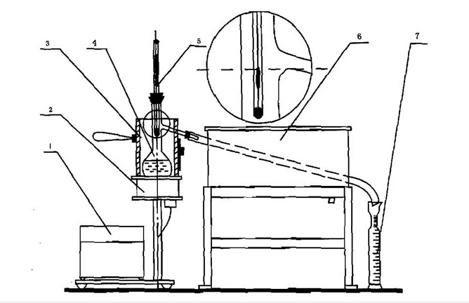 6、初餾點和餾程儀器設備:(符合SH/T 0121-1992的各項要求)①電器裝置。②電爐。③燒瓶罩。④恩氏蒸餾燒瓶(容量100mL)。⑤溫度計(棒式局浸式有膨脹室的水銀溫度計,范圍140-200℃,分度值0.5℃)。⑥冷凝管。⑦異徑量筒(容量100mL,)。⑧氣壓計。⑨石棉墊。⑩鐵架臺。11秒表。12冷凝器座架。13冷凝器水槽。