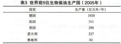 歐盟尤其是德國,主導了世界生物柴油的生產(chǎn)和使用。表3列出世界前5位生物柴油生產(chǎn)國。
