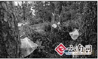 根據(jù)工作人員的指點(diǎn),記者終于找到了雞冠山村,徒步走到了位于村后山上的松樹林。遠(yuǎn)遠(yuǎn)看去,松林十分粗壯茂盛,平均高度至少有十多米。隨著往里走,記者發(fā)現(xiàn)沿路不少松樹都被人割了皮,傷口呈Y字形,“Y”字形開(kāi)口處寬度至少有二三十厘米,外層表皮已沒(méi)有了,露出了白色的內(nèi)層。在表皮被刮開(kāi)的部分,自下而上被割開(kāi)了幾條溝,一條比一條割得深。而在溝下面則掛有一只透明的塑料袋,袋子兩邊用木釘緊緊釘在樹上,袋口內(nèi)側(cè)嵌在割開(kāi)的樹里,這樣的樹木僅在雞冠山村這個(gè)方向保守估計(jì)也有幾千棵。