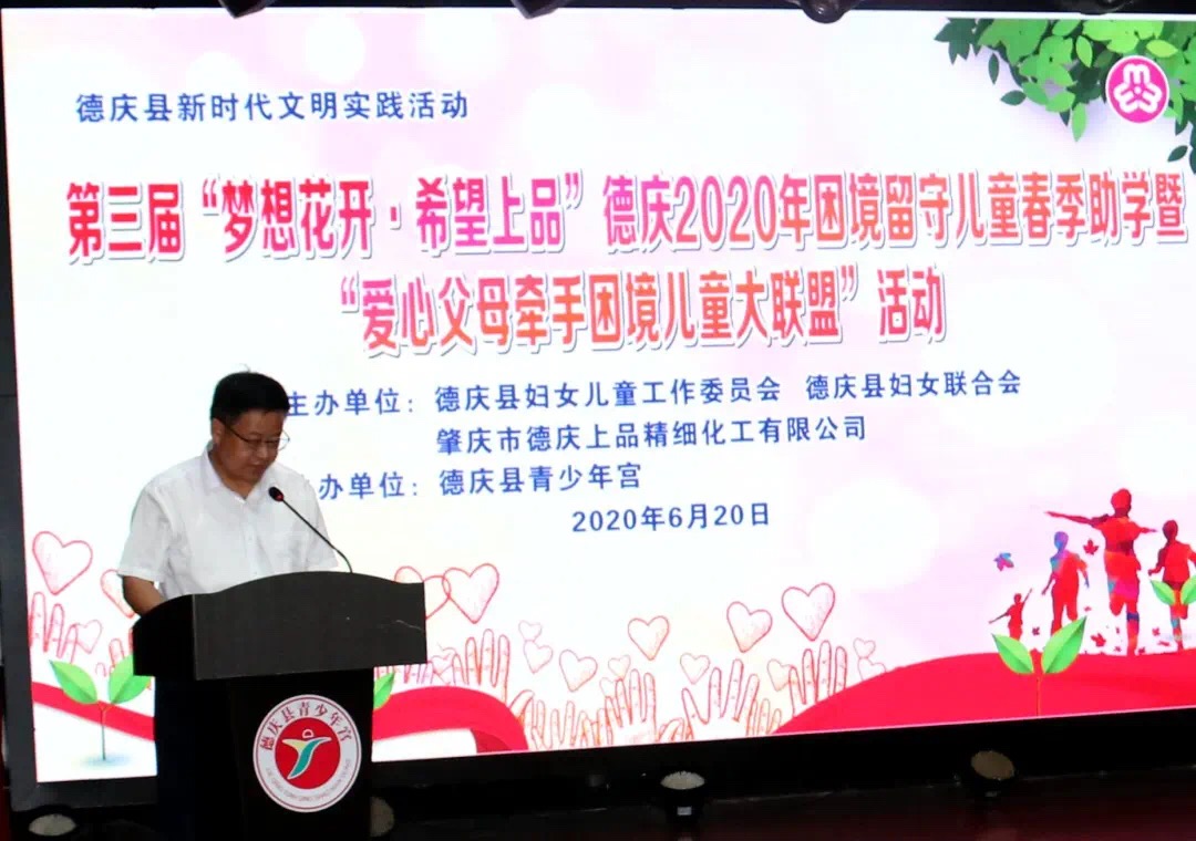 在20日當(dāng)日的活動(dòng)中,周啟斌先生作重要講話。他說:今年是中央政府全面打贏扶貧脫貧攻堅(jiān)之年,是全面建成小康社會(huì)目標(biāo)實(shí)現(xiàn)之年。讓中國(guó)幾千萬人全部脫貧,責(zé)任之大、任務(wù)之重前所未有。這就需要我們所有人都能夠伸出援手扶一把,特別是幫助那些貧困家庭的孩子們,資助他們繼續(xù)求學(xué)讀書,讓讀書求知之路一個(gè)都不能少!但是,新年伊始,一場(chǎng)突如其來的新型冠狀肺炎疫情在全國(guó)直至全球迅速蔓延,讓我們每個(gè)人身臨其中,經(jīng)歷了一場(chǎng)難以忘懷的“戰(zhàn)疫”,給每個(gè)人、每個(gè)家庭的生活、工作都帶來了不同程度的影響,企業(yè)停工停產(chǎn),學(xué)校停課,尤其給臨近中高考的學(xué)生們帶來了挑戰(zhàn)?,F(xiàn)在國(guó)內(nèi)的疫情在政府的有力的管控下取得了突破性的進(jìn)展,各年級(jí)的學(xué)生也相繼走回了校園,我們欣喜地看到孩子們好像突然之間長(zhǎng)大了很多,疫情雖然阻擋了他們學(xué)習(xí)知識(shí)的進(jìn)度,但是沒有阻擋他們成長(zhǎng)的步伐。所謂少年強(qiáng)則國(guó)家強(qiáng),關(guān)愛孩子,就是關(guān)心祖國(guó)的未來。孩子是祖國(guó)的花朵,兒童是民族的未來,讓他們健康、快樂地成長(zhǎng),是我們義不容辭的責(zé)任。為了把美好的牽掛化作實(shí)實(shí)在在的行動(dòng),我公司和我本人協(xié)同社會(huì)的一些熱心人士,共同伸出援手,在德慶縣婦聯(lián)的大力支持下,共建“夢(mèng)想花開·希望上品”關(guān)愛德慶困境兒童公益項(xiàng)目,以此舉拋磚引玉、希望能夠吸引更多的社會(huì)各界熱心人士奉獻(xiàn)愛心,將該項(xiàng)公益活動(dòng)不斷發(fā)展壯大,讓更多的困境兒童受益!贈(zèng)人玫瑰,手留余香!希望我們共同伸出友愛的雙手,去愛護(hù)、去支持身陷困境中的孩子,讓他們也同樣放飛夢(mèng)想,收獲希望!