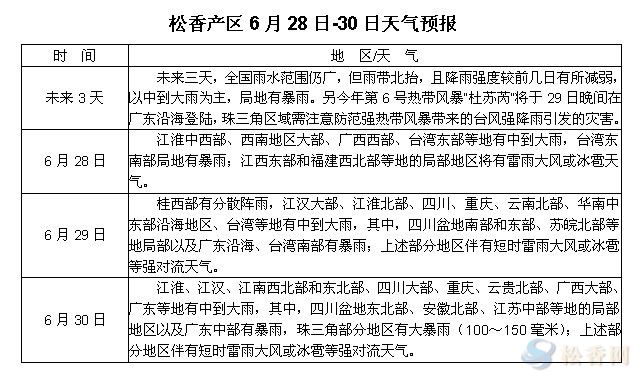 華訊松香網(wǎng)提醒:未來三天各主產(chǎn)區(qū)降雨天氣仍較頻繁,但隨雨帶北移,降雨強度較前有所減弱。29日,隨著強熱帶風(fēng)暴“杜蘇芮”將在廣東沿海登陸,兩廣等地或?qū)⒂瓉硇乱惠喗涤辍?月期間的連續(xù)降雨是影響松脂量的一個重要影響因素,即將進入7月,各方仍需關(guān)注天氣、價格、心態(tài)等因素對松脂量的影響。