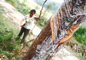 據(jù)市綠色志愿者聯(lián)合會(huì)吳登明調(diào)查,目前我市銅梁、永川、墊江、涪陵等地,至少有1萬畝松林正在被割油。采集的松脂被集中到當(dāng)?shù)匾恍┢髽I(yè),生產(chǎn)松香和松節(jié)油。