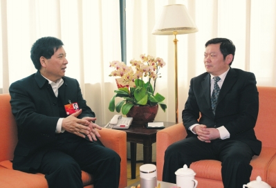 圖為云南省委書(shū)記秦光榮(左)接受本報(bào)記者采訪。本報(bào)記者 徐華 攝